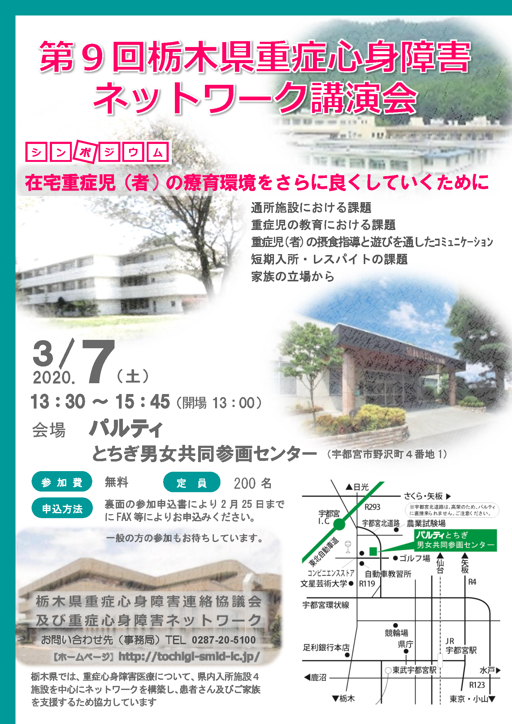 栃木県重症心身障害連絡協議会では、来る令和2(2020)年3月7日(土)に「在宅重症児(者)の療育環境をさらに良くしていくために」と題し、第9回目となる講演会(シンポジウム)を開催する予定でしたが、新型コロナウイルス感染症の感染拡大の防止のため、参加者の皆さまや関係者の健康と安全を第一に考慮し、講演会(シンポジウム)の開催中止を決定いたしましたので、お知らせいたします。